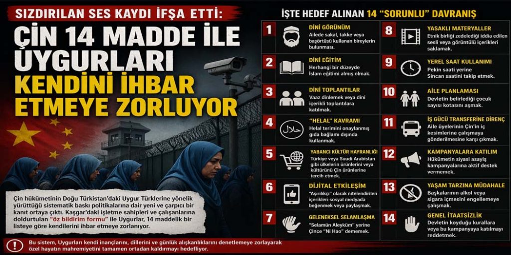 Norveç merkezli Uygur Hjelp kuruluşu tarafından sızdırılan ses kaydı. “14 Sorunlu Davranış” listesi, İslami selamlaşmadan takke takmaya kadar Uygur kimliğinin temel unsurlarını “suç” kapsamına alıyor. Katılımcılar, kendilerini veya aile üyelerini bu maddelere göre ihbar etmeye teşvik ediliyor.