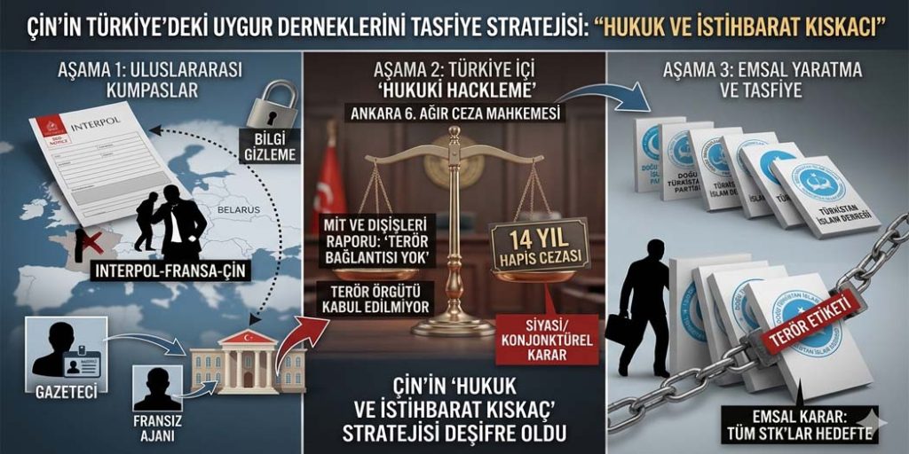 “Çin’in Türkiye’deki Uygur derneklerine yönelik hukuk ve istihbarat kıskacı stratejisini gösteren infografik analiz. MİT raporu, İnterpol suistimali ve 14 yıllık mahkeme kararı detayları.”